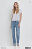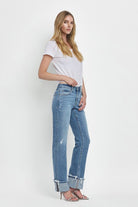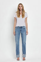 COMFORT STRETCH DENIM, MID RISE WAIST, DISTRESSED DETAIL, SINGLE CUFF HEM, FULL LENGTH, STRAIGHT JEANS