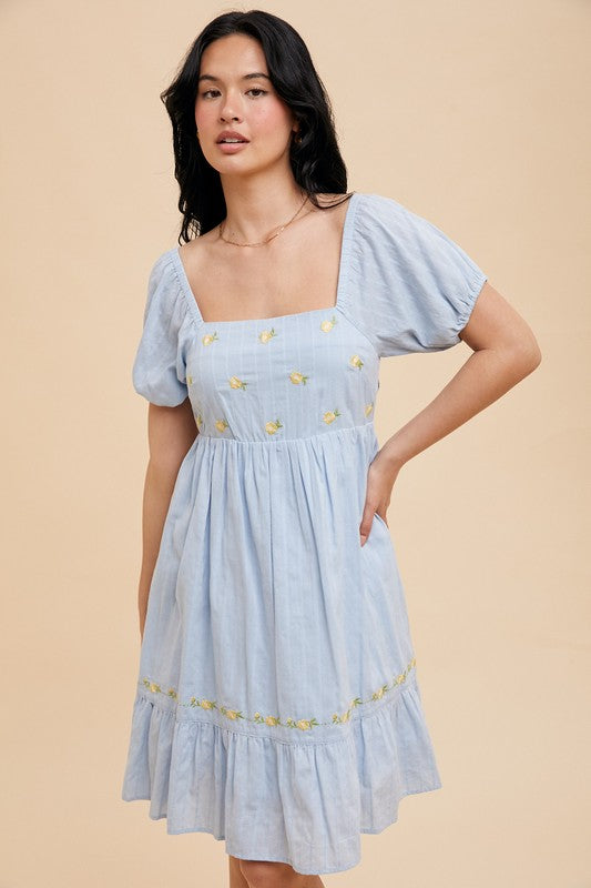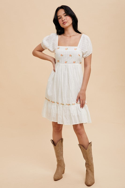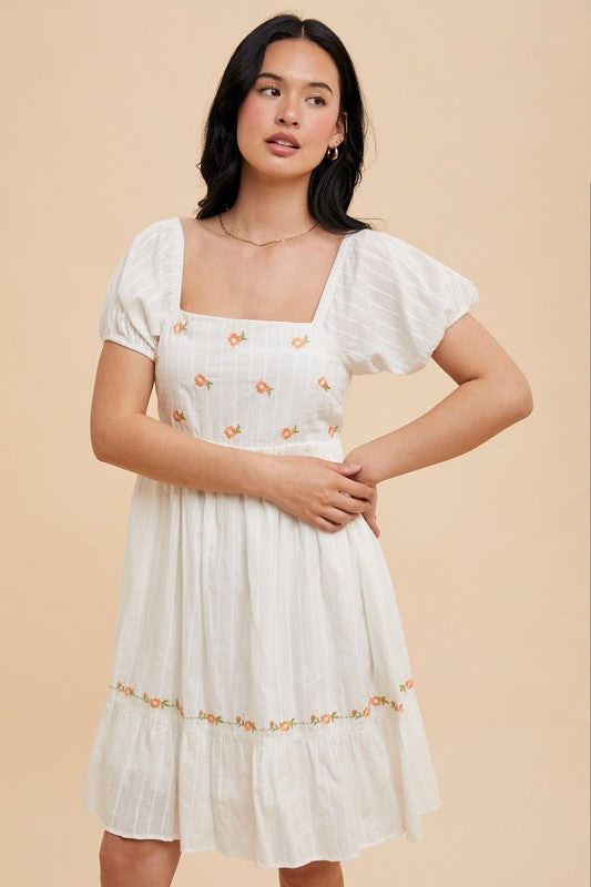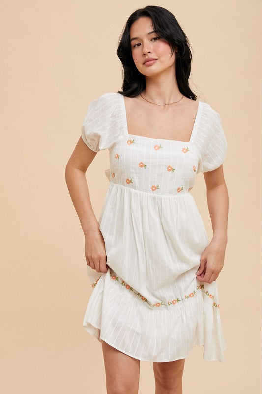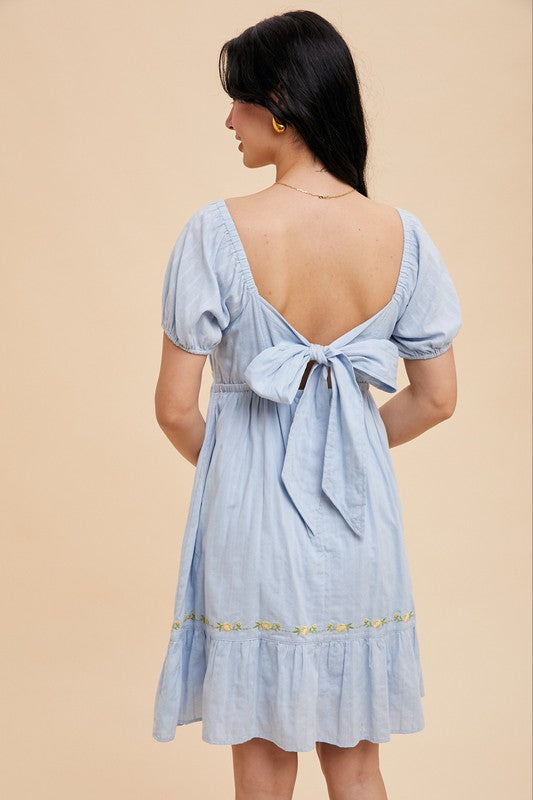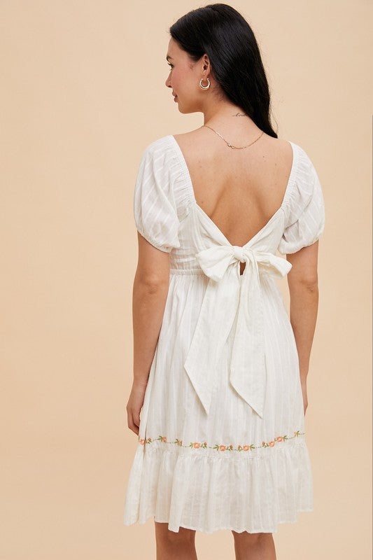 FLORAL EMBROIDERED SQUARE NECK MIDI DRESS FEATURES OPEN BACK WITH BOW CLOSURE, INVISIBLE BACK ZIPPER, AND FULL LINING.