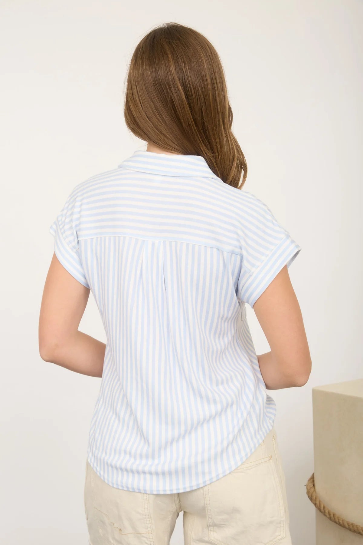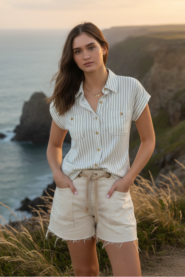 COLLARED BUTTON DOWN SHORT SLEEVES POCKET DETAIL WITH BUTTON VERTICAL STRIPE PATTERN NOT LINED WOVEN TOP 63%POLYESTER 34%RAYON 3%SPANDEX