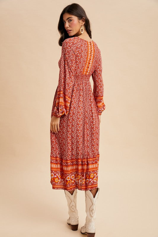 GORGEOUS BORDER PRINT MIDI DRESS FEATURING ELASTICATED SLEEVE OPENING, SMOCKED BACK WAISTBAND, BACK BUTTON CLOSURE FROM NECK TO WAIST, AND FULL LINING.