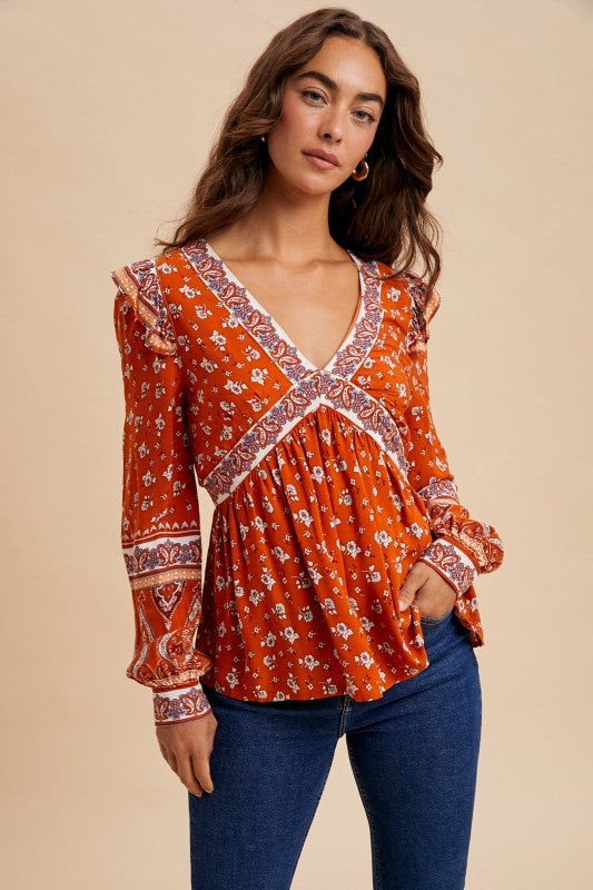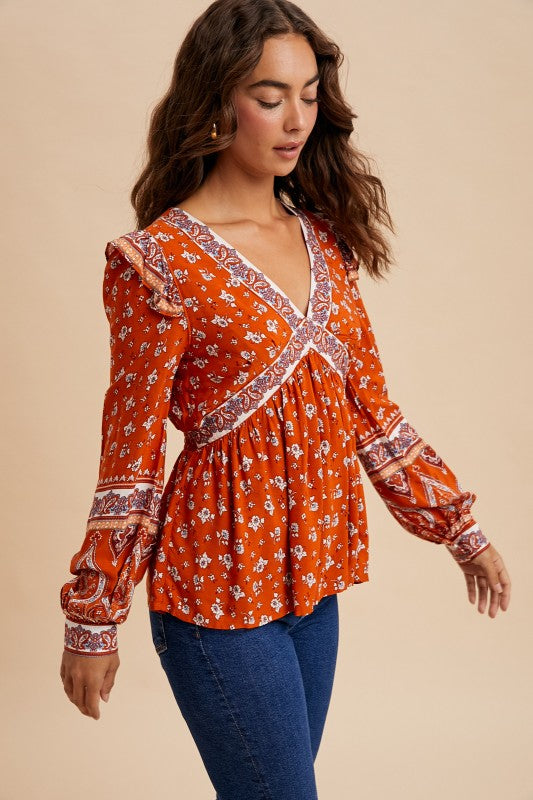 MULTICOLOR FLORAL BORDER PRINT TOP FEATURES LINING, BUTTON WRIST CLOSURE,