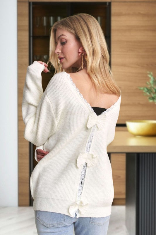 LACE TRIM V NECK SWEATER TOP WITH BOW BACK ACCENT