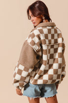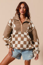 CHECKERED FLEECE BLOCK PULLOVER TOP WITH POCKETS AND DRAWSTRING HEM