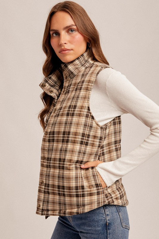 PLAID PUFF SNAP BUTTON DOWN VEST WITH POCKETS