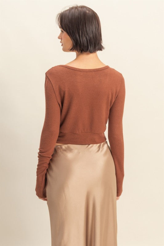 Embrace The Upcoming Season With This Cute Top. Crafted From Brushed Fabric, This Top Comes With A V-Neckline And Long, Fitted Sleeves. The Partial Button Front Placket Is Non Functional And Leads To A Cropped Hem.