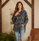 AZTEC PRINT SHACKET FEATURES FUNCTIONAL BUTTONED BREAST POCKETS, BUTTON FRONT, AND DROP SLEEVES. CONTENTS: SELF: 100% POLYESTER