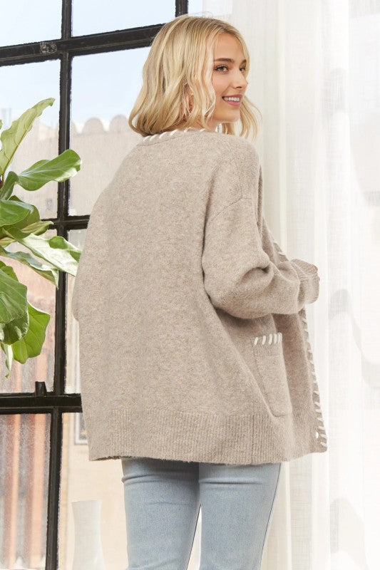 OVERSIZED CARDIGAN WITH A V-NECKLINE WHITE CONTRAST STITCHING EDGES AND POCKETS