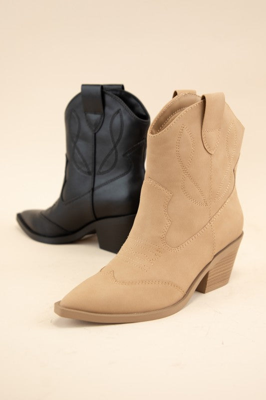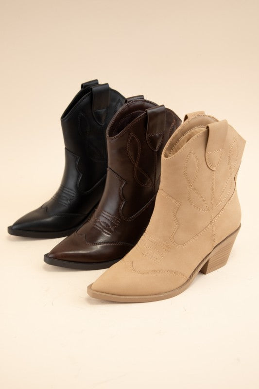 Embrace timeless Western style with these chic ankle boots featuring intricate embroidery details. Designed with a sharp pointed toe and a comfortable stacked heel, these boots offer both sophisticated appeal and stability for all-day wear. The classic Western-inspired stitching adds an authentic touch, making them a standout piece. Perfect for adding a touch of rustic charm to jeans, skirts, or dresses, these boots are a versatile must-have for any wardrobe.