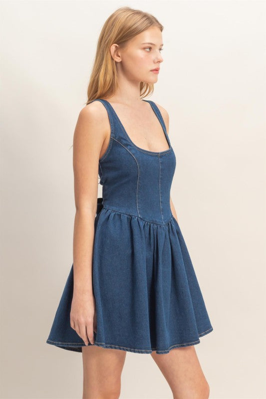 This denim dress features a square neckline and a flared silhouette, enhanced by enzyme garment wash for a soft finish. Pair with ankle boots and a statement belt for a chic daytime outfit.