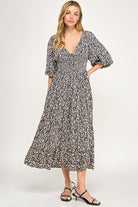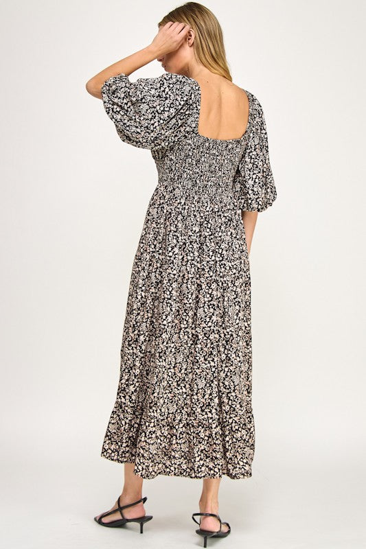 Ditsy Floral, Bubble Sleeve, Smock Back With Front Tie And Lining Maxi Dress.Model Height: 5'9.5"Model Measurements: 33-25-34Fabric ContentsSelf: 100% Rayon.Lining: 100% Rayon.