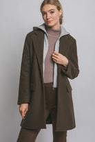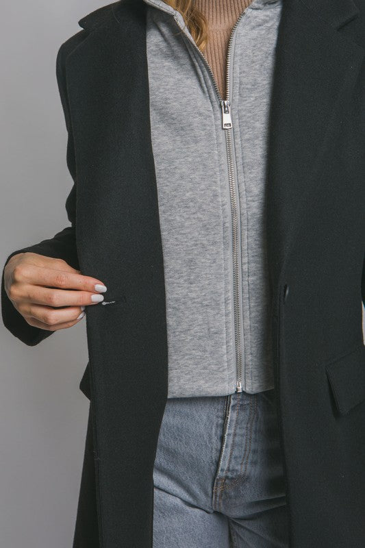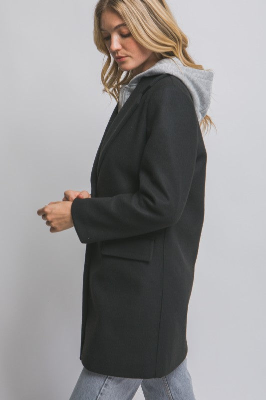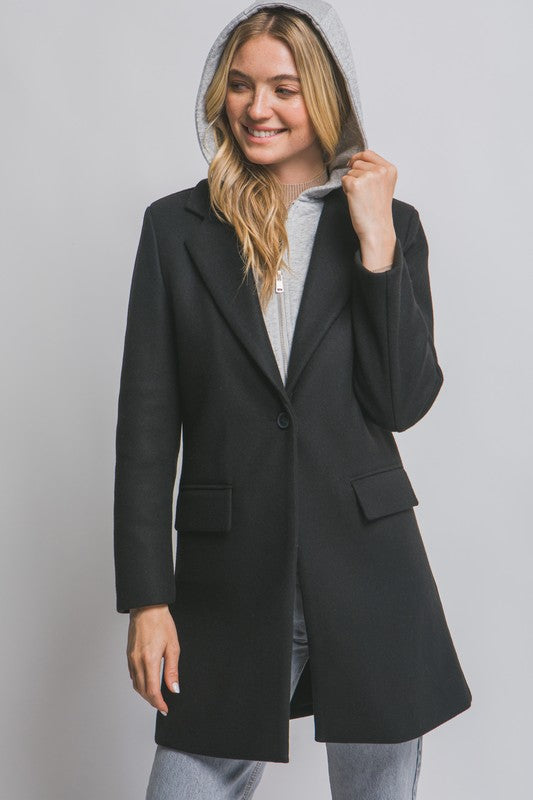 - Hooded Contrast is not removable, Zip & One Button Closure & Two Front Flap Pockets