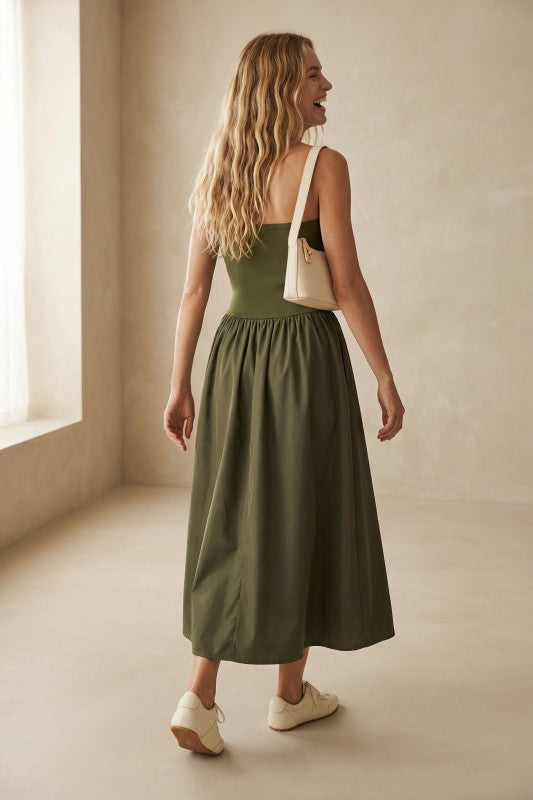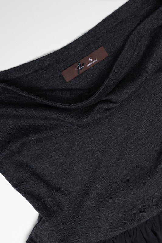 Two-tone contrast with a soft jersey knit top and structured woven skirt