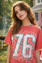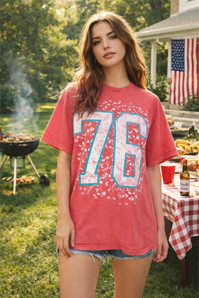 This vintage-inspired graphic tee is a must-have for any fashion-forward wardrobe. Featuring a distressed mineral-wash in a vibrant coral hue, it offers a relaxed, oversized fit that drapes effortlessly. The front showcases a bold "76" graphic, rendered in a crisp white with a puff-print turquoise outline, set against a delicate, all-over floral print in a lighter shade of white.