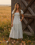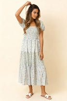 SQUARE NECK PUFF SHORT SLEEVE SMOCKED FIT AND FLARE COLOR BLOCK TIERED MAXI LENGTH VINTAGE FLORAL PRINT WOVEN DRESS WITH SIDE POCKETS