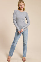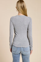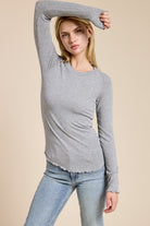 Designed to hug just right, this ribbed long sleeve features a smooth, body-skimming fit with refined seam detailing for a clean, elevated look. The softly finished neckline and subtle lettuce-edge hem add a feminine touch, while the lightweight stretch fabrication makes it perfect for layering or wearing on its own. A timeless essential that feels effortless yet polished, ideal for everyday styling.