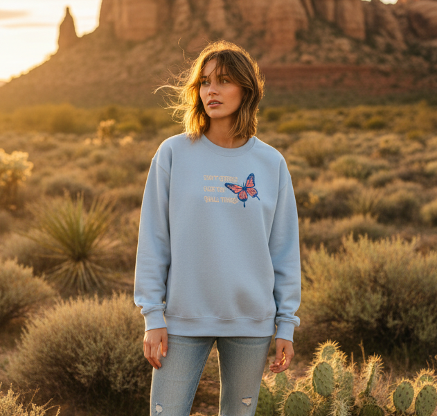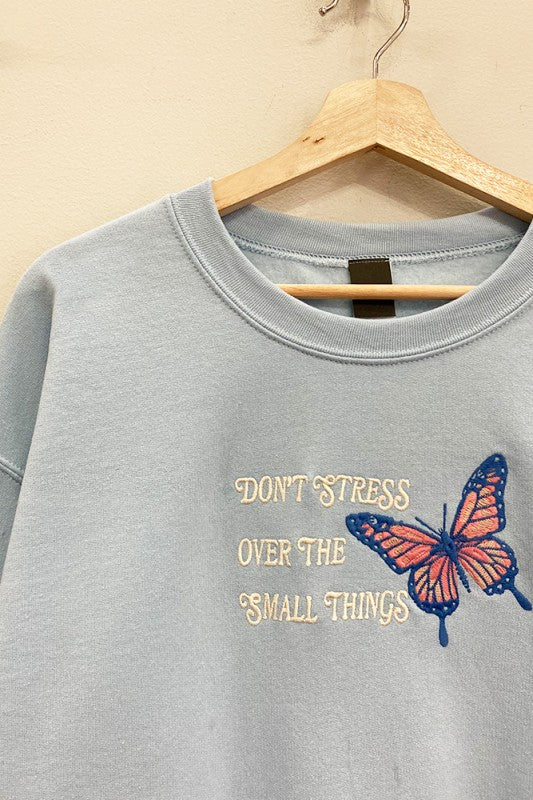 LONG SLEEVE CREW-NECK "DON'T STRESS OVER THE SMALL THINGS" BUTTERFLY EMBROIDERED OVERSIZED GRAPHIC SWEATSHIRT TOP