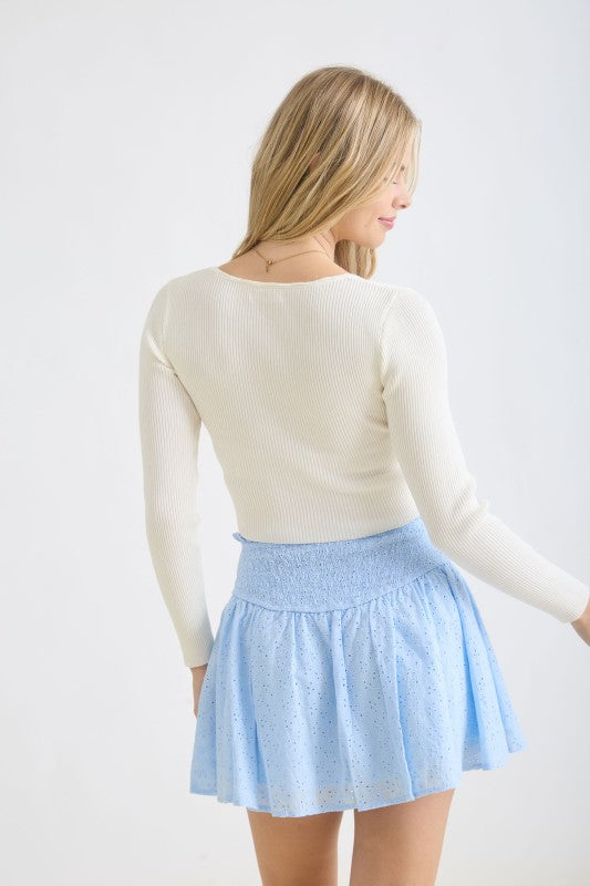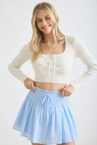 SCOOP NECKLINELONG SLEEVESFRONT TIE DETAILFLORAL EMBROIDERY PATTERNCROPPEDKNIT PULLOVER SWEATER
