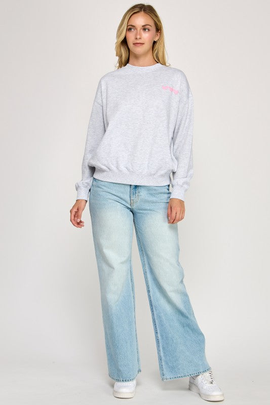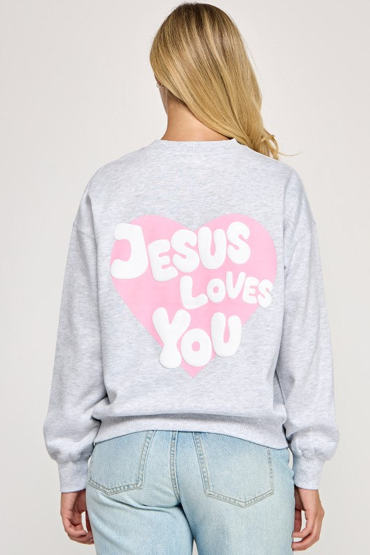 BASIC FLEECE RELAXED FIT CREW NECK SWEATSHIRT WITH JESUS LOVES YOU PUFF PRINT