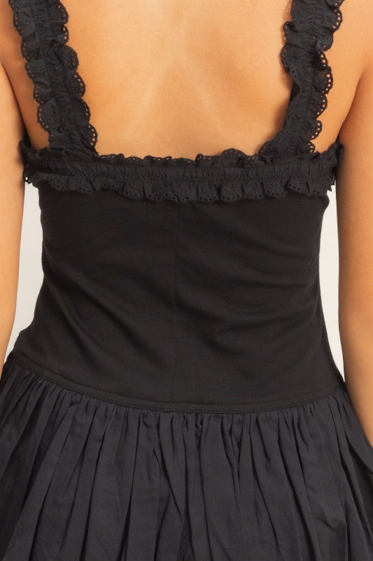 This charming mini dress features a shirred bodice and functional button placket for a flattering, textured fit. Detailed with embroidered ruffle straps and a playful tiered skirt, it creates a sweet, voluminous silhouette. Pair with cowboy boots or sandals for a fun, spirited look.