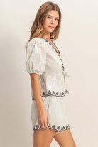 A striped peplum blouse featuring a deep V-neckline outlined with delicate scalloped lace trim and dual tie-front closures. The embroidered hem adds a touch of charm and craftsmanship, elevating the striped pattern with subtle contrast.