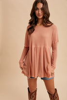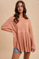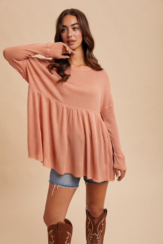 TEXTURED LIGHTWEIGHT RAYON KNIT TOP FEATURING A BABYDOLL BODY AND RAW EDGE HEM ACCENTS FOR THAT LIVED IN LOOK. FIT IS A RELAXED FIT.