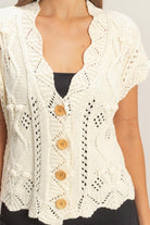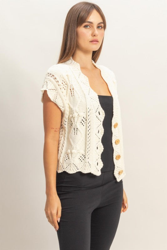 This short-sleeve crochet sweater features a scalloped trim and large wooden buttons. Pair with high-waisted denim shorts for a relaxed summer vibe.