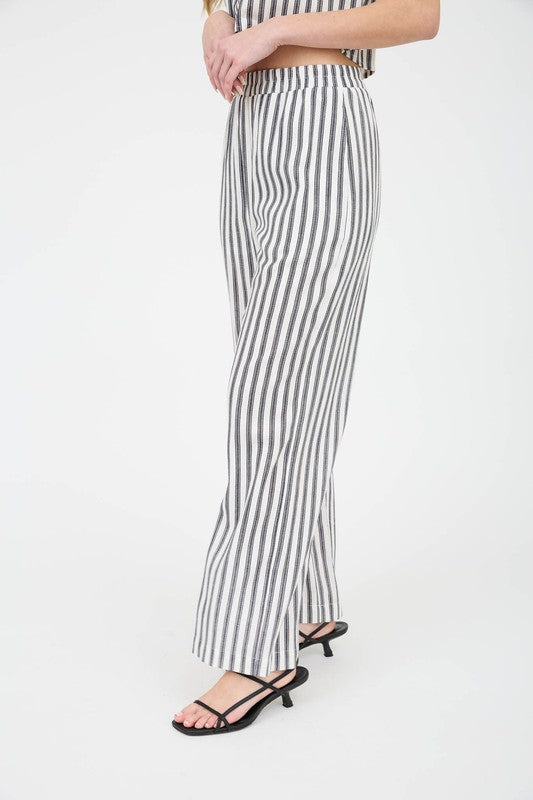 HIGH ELASTIC WAISTPOCKETSPLEAT DETAILWIDE LEGSTRIPE PATTERN LINEDLINEN BLENDLOUNGE PANTSFabric ContentsSELF: 90%RAYON 10%LINENLINING: 100% POLYESTER