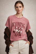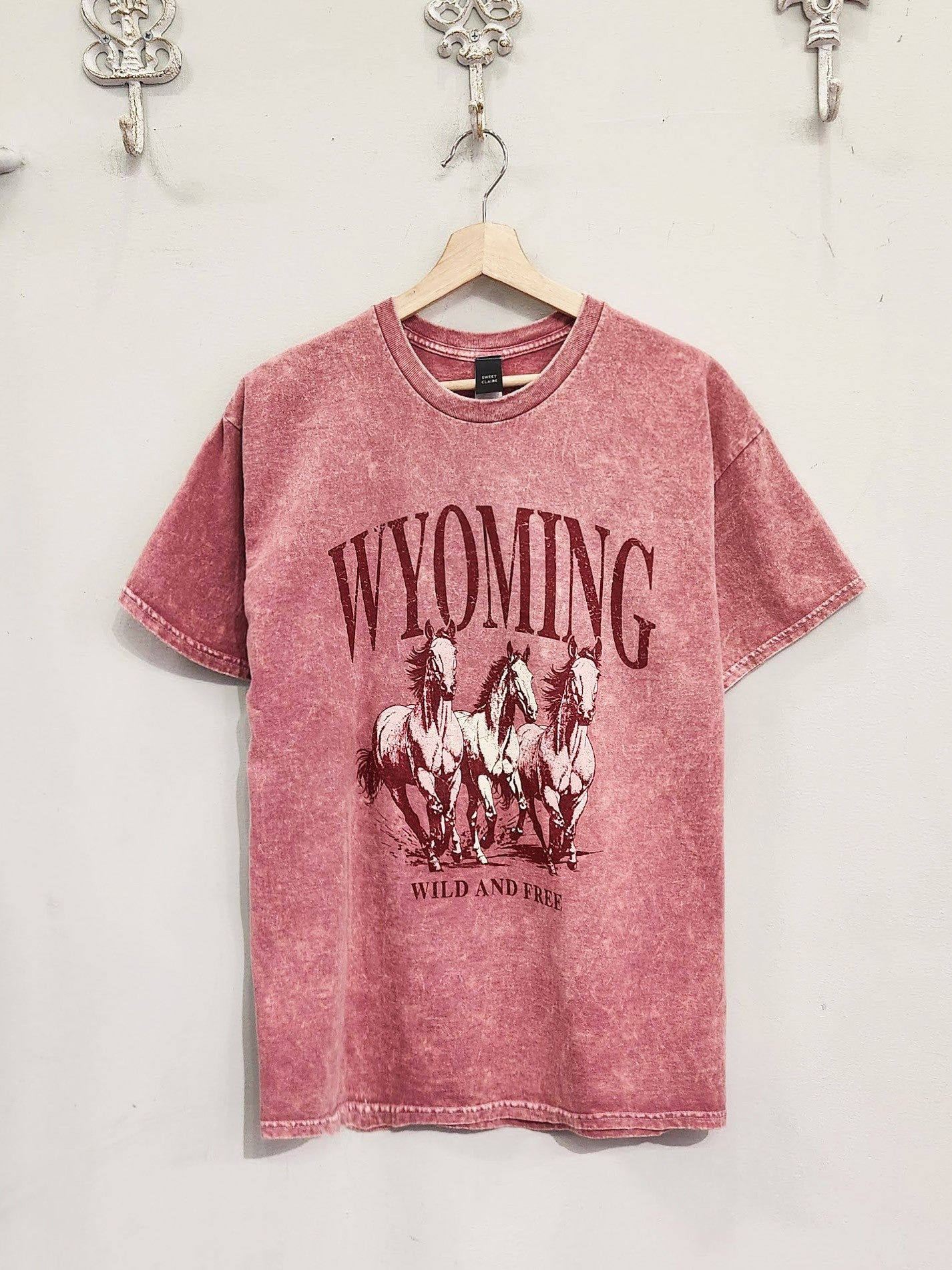 Crafted from ultra-soft, mineral-washed cotton, this tee features a rich, lived-in rose hue that feels both elevated and relaxed. The vintage-inspired "WYOMING" graphic, paired with a striking trio of running horses, evokes a sense of freedom and quiet strength-subtle nods to wide-open landscapes without leaning overly western.