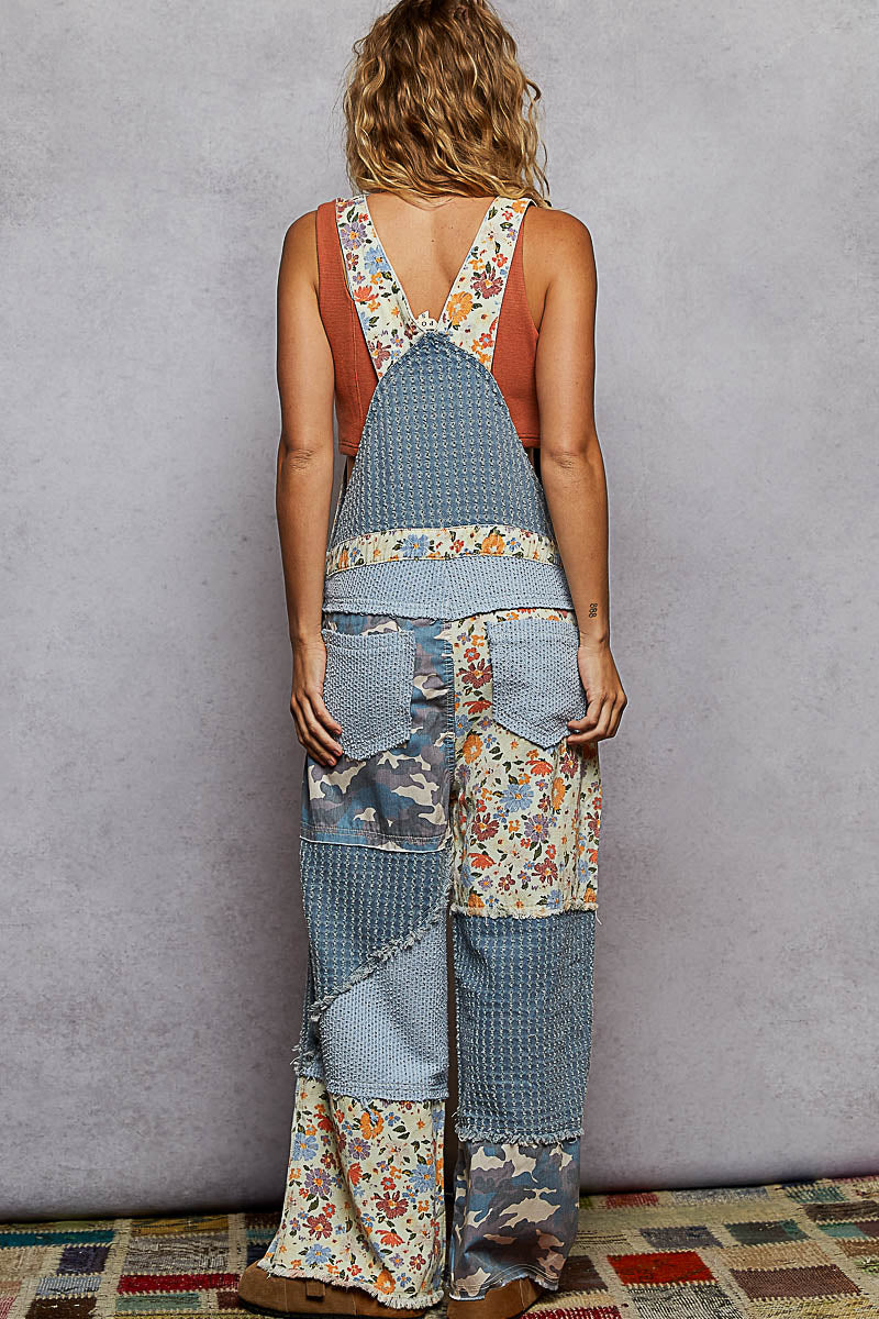 Animal Printed Floral Print Frayed Edge Twill Woven Overalls