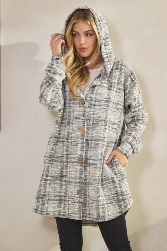LONG PUFF SLEEVE CHECKER BOUCLE FABRIC BUTTON DOWN CARDIGAN WITH SIDE POCKET AND DOLPHIN HEM DETAIL