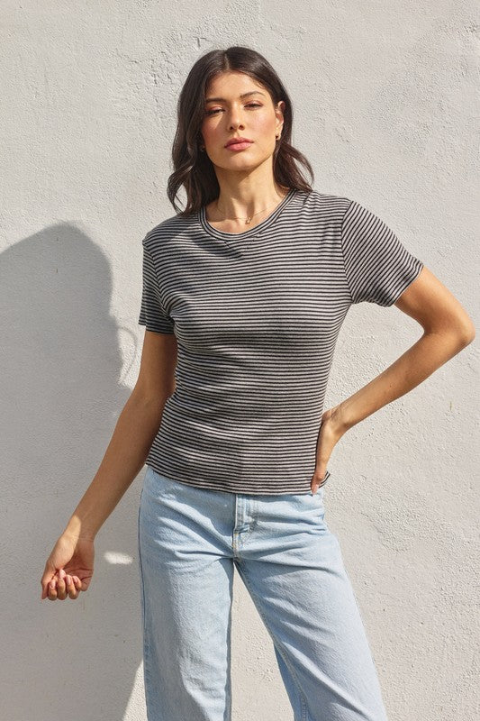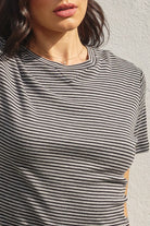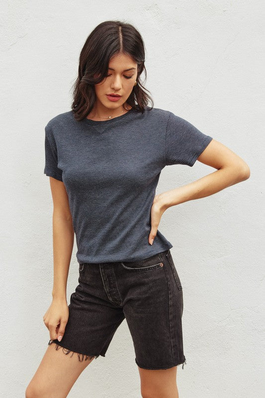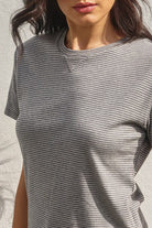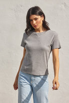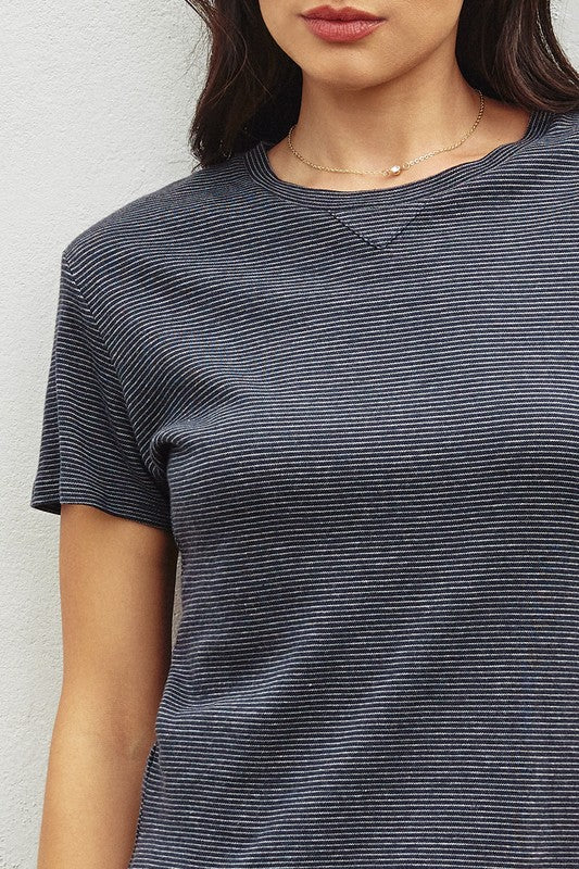 This is a slim fit t-shirt with a V-insert on the front collar and made with medium weight soft cotton rayon. Model is 5'8" and wearing size Small.