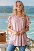 DOLMAN SHORT SLEEVE WITH BAND V NECK WITH BAND SOLID URBAN RIBBED TOP WITH ROUND HEM AND STITCH DETAIL