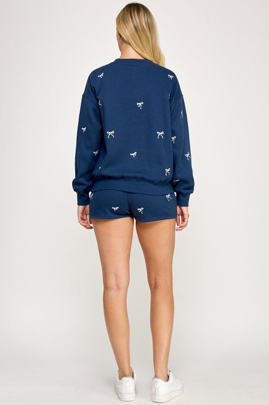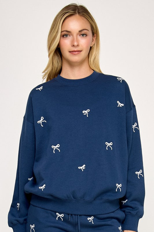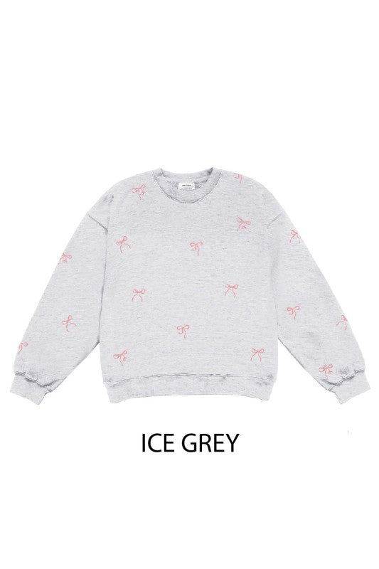 BASIC FLEECE RELAXED FIT CREW NECK SWEATSHIRT WITH BOW ALL OVER EMBROIDERY
