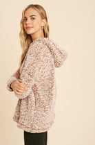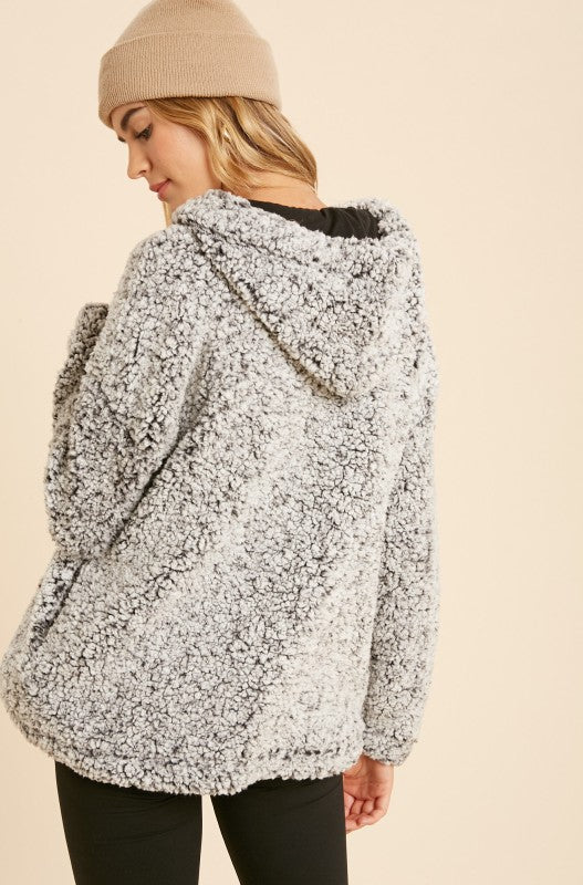 SUPER SOFT COZY SHERPA PULLOVER WITH HOOD, 1/4 ZIPPER PULLUP, DRAWSTRINGS AND SIDE POCKETS.