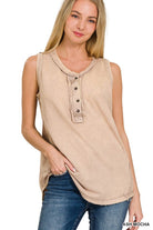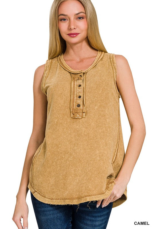 WASHED HALF-BUTTON RAW EDGE SLEEVELESS HENLEY TOP