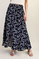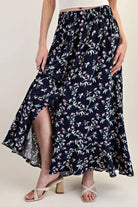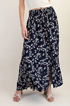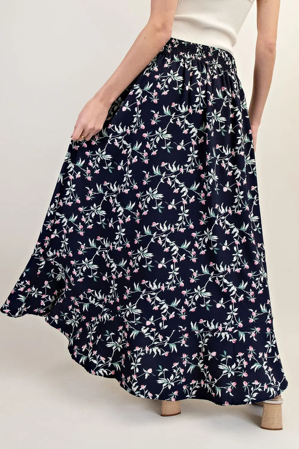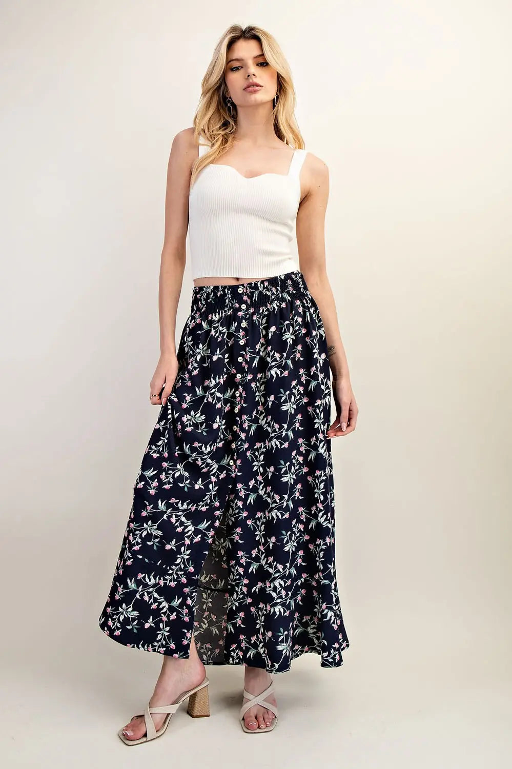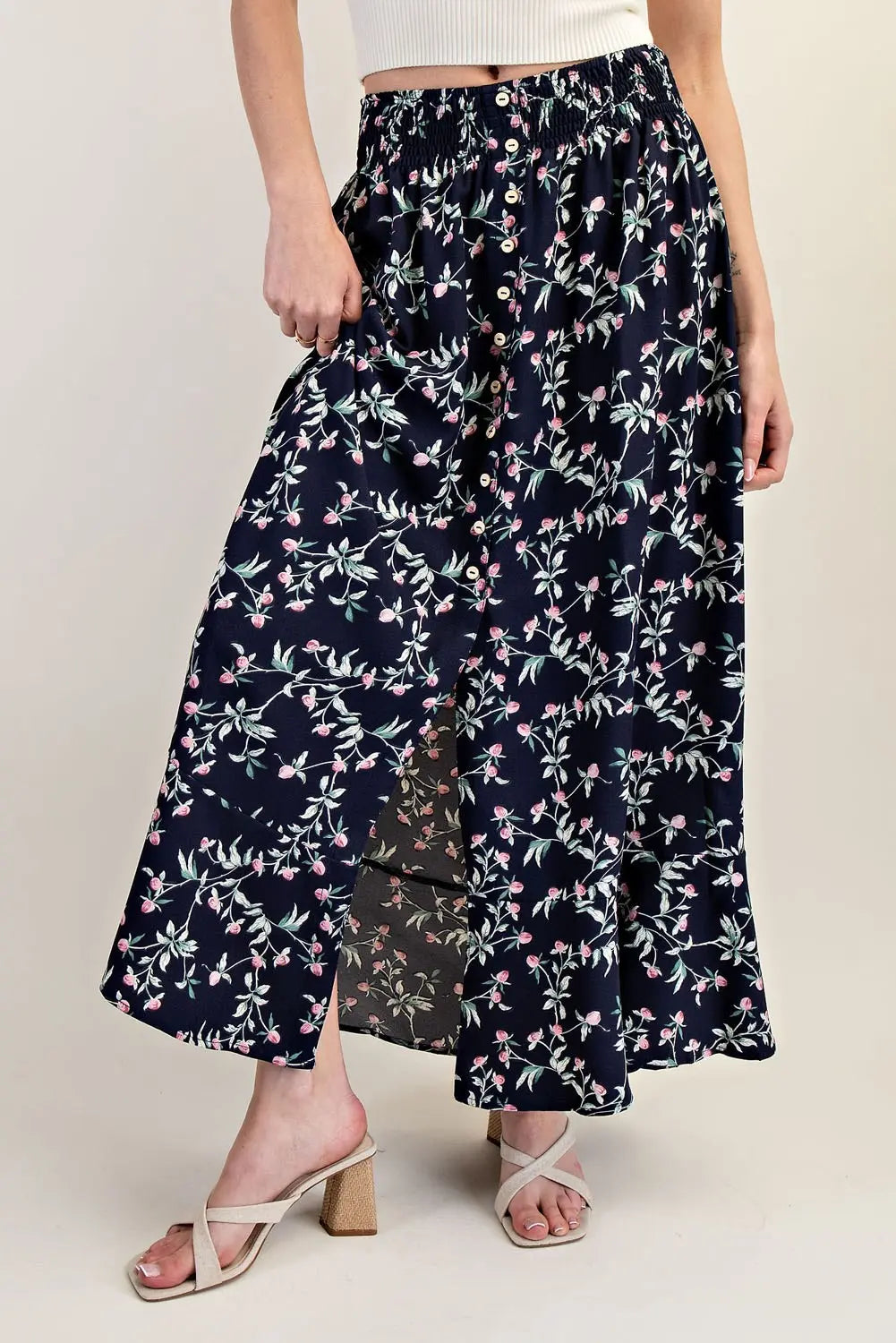 Floral printed maxi skirt featuring a smocked waistline, a buttoned down front creating a slit and is a loose fit silhouette.