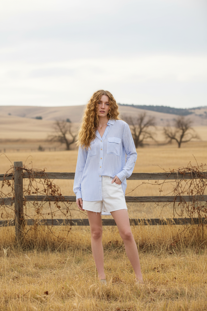 COLLARED BUTTON DOWN CLOSURE LONG SLEEVES WITH BUTTONED CUFFS ROLL UP SLEEVES WITH TAB BACK YOKE NOT LINED STRIPE PATTERN Fabric ContentsSHELL: 100% RAYON