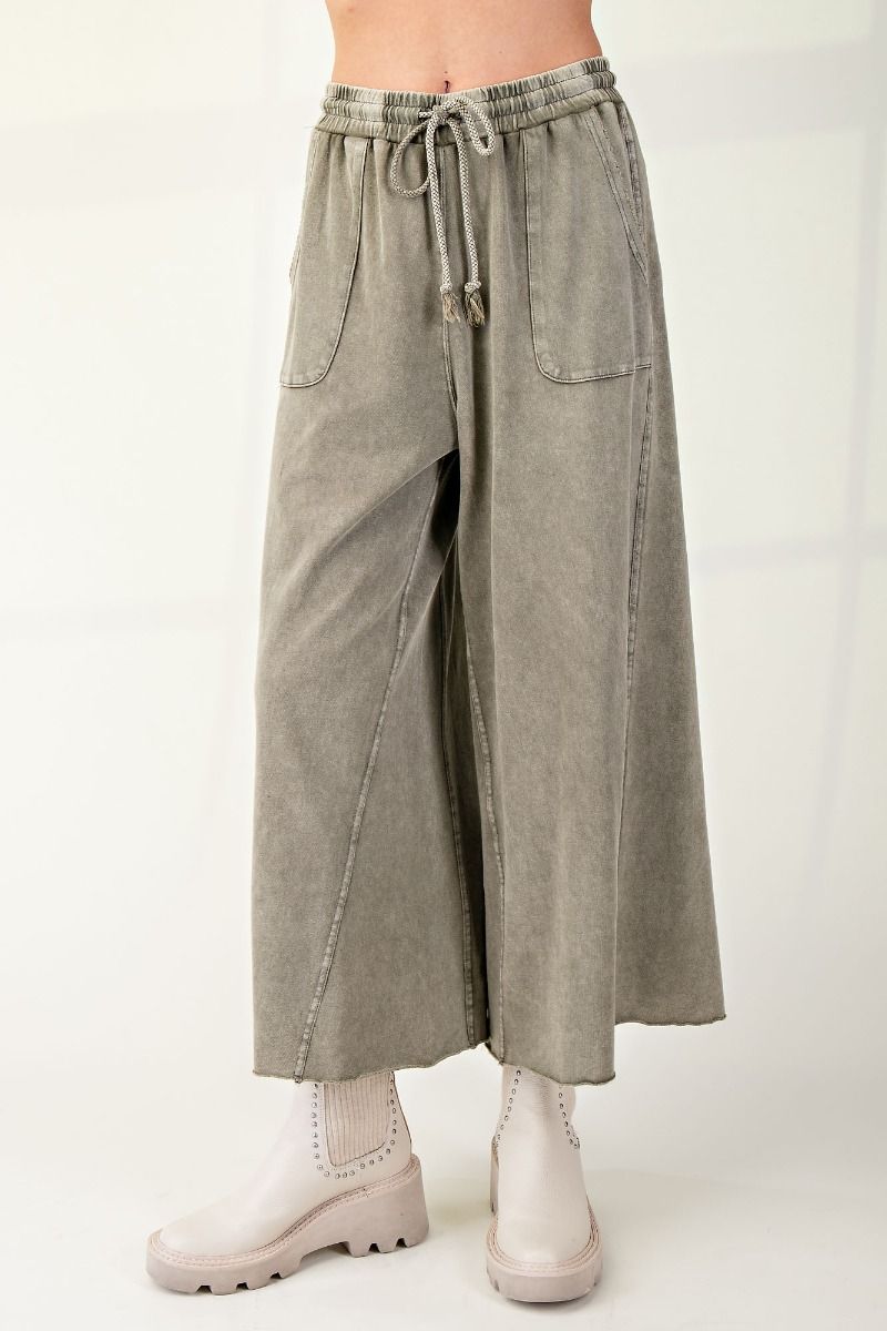 Description: WASHED TERRY KNIT WIDE PANTS-WIDE LEG SILHOUETTE-ADJUSTABLE DRAWSTRING-SIDE POCKETS-UNFINISHED TRIM-RELAXED SILHOUETTE-MODEL HEIGHT 5'10