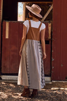 Patchwork plaid overall dress with a corduroy top, adjustable straps, and a full A-line silhouette.