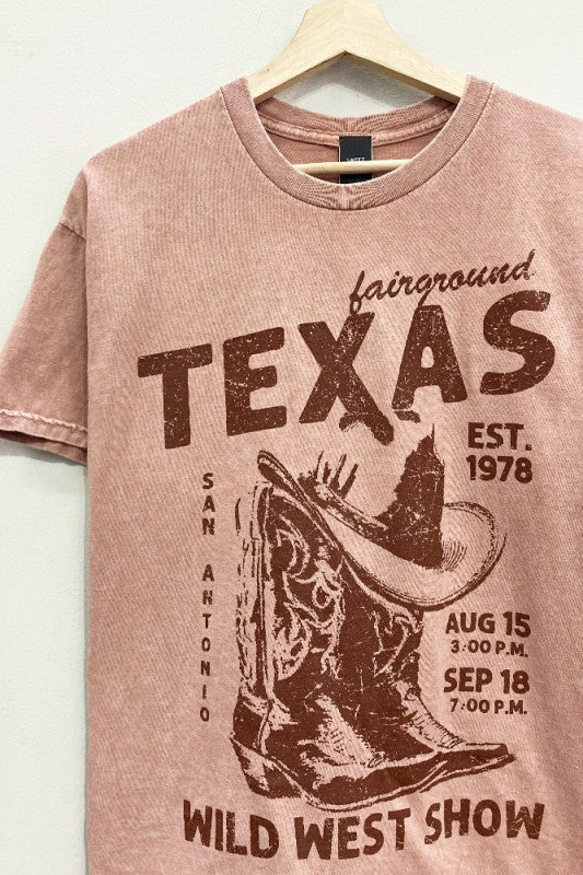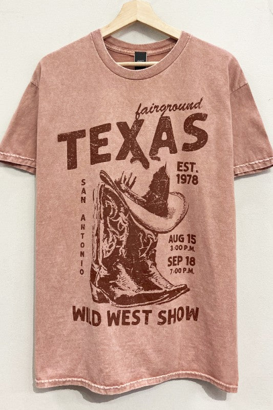 SHORT SLEEVE GARMENT-DYED/MINERAL-WASHED "TEXAS-WILD WEST SHOW" WESTERN COWGIRL/COWBOY BOOTS OVERSIZED SUMMER  GRAPHIC TEE