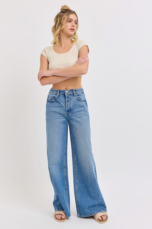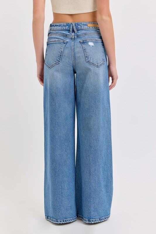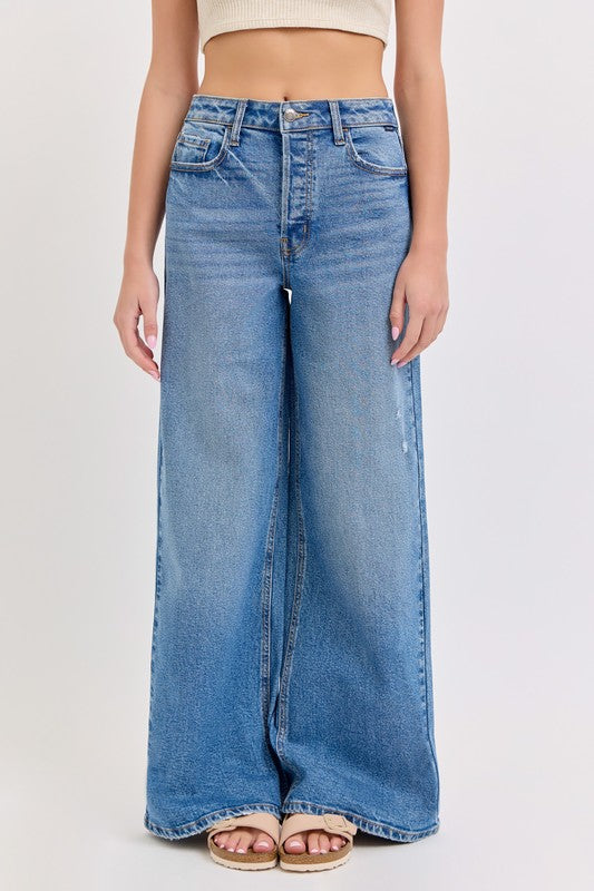 These high-rise wide-leg jeans have a 32" inseam and are the perfect medium wash making them versatile enough to complement any outfit.