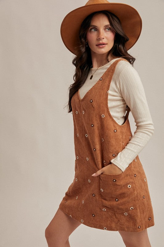 FLORAL EMBROIDERED CORDUROY PINAFORE OVERALL DRESS WITH POCKETS