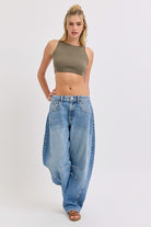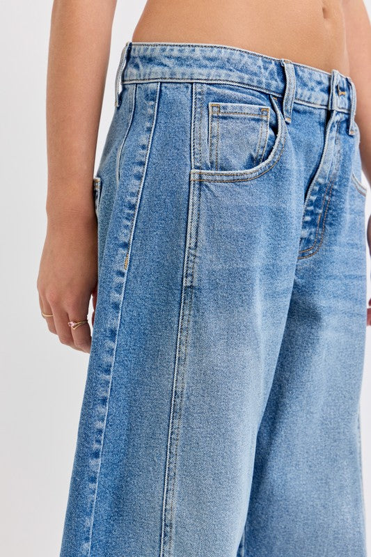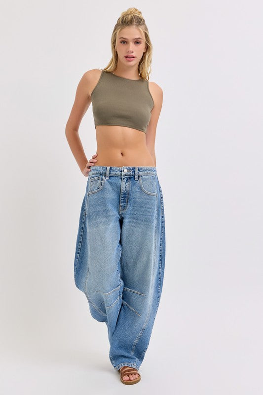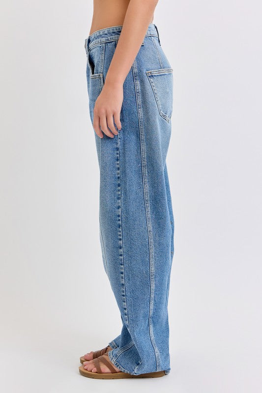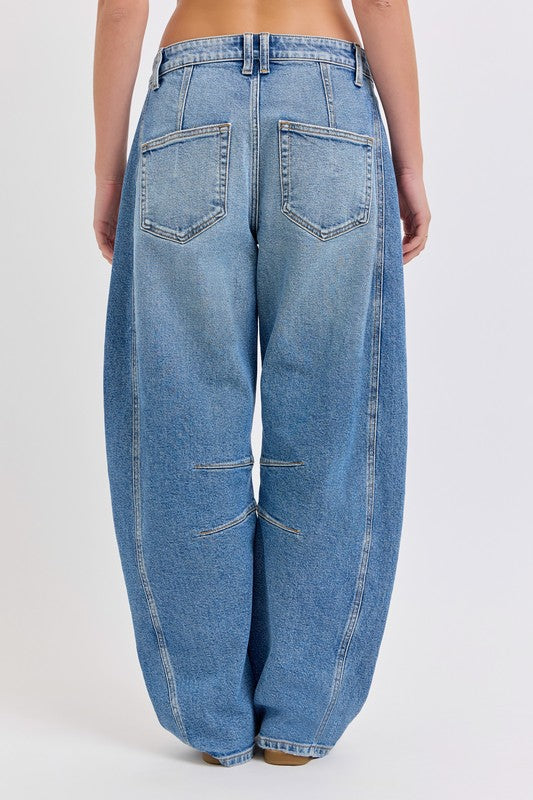 Mid-Waisted Barrel jean Dart Details Long Inseam Belt loops + Zip fly Medium denim FRONT RISE 11 3/4", INSEAM 31"