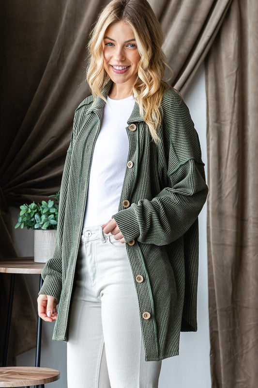 LONG PUFF SLEEVE BASIC COLLAR NECK SOLID URBAN RIBBED BUTTON DOWN SHACKET TOP WITH ROUND HEM AND STITCH DETAIL