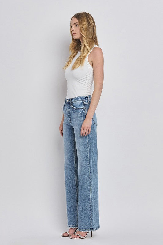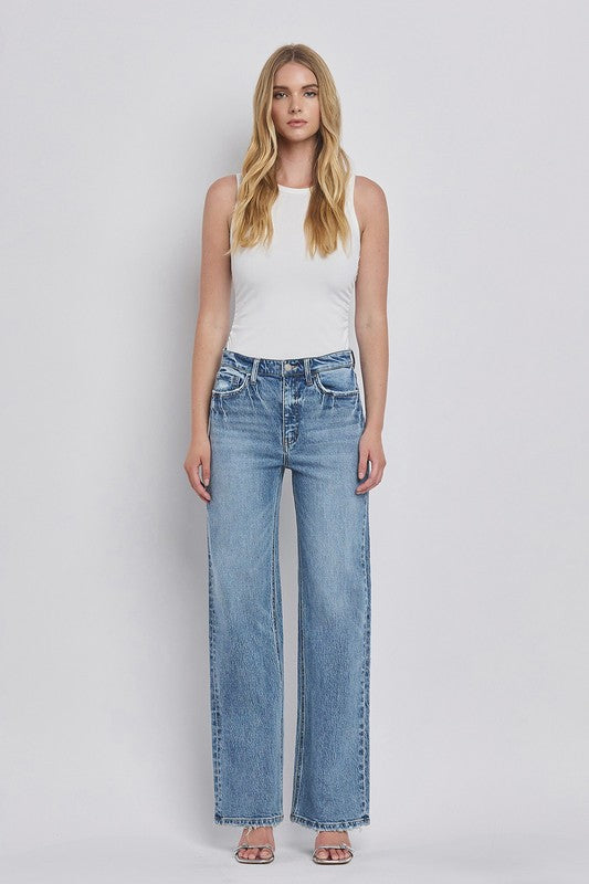 COMFORT STRETCH DENIM, SUPER HIGH RISE WAIST, LIGHTLY DISTRESSED DETAIL, FINISHED HEM, FULL LENGTH, 90'S WIDE JEANS