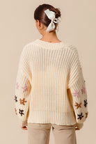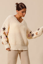 LOOSE FIT V NECK SWEATER TOP WITH FLOWER EMBROIDERED SLEEVES