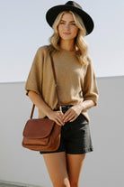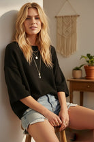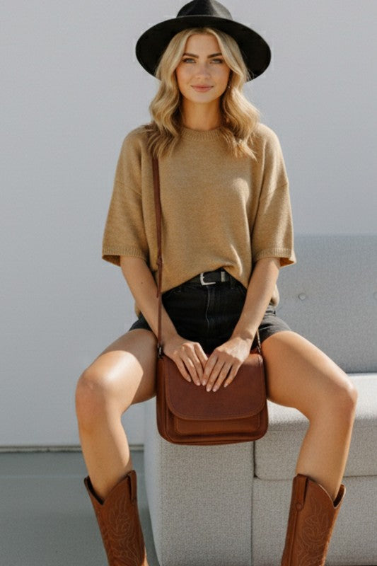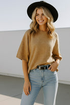 A cozy short sleeve sweater top with a relaxed silhouette, ribbed crew neckline, and soft knit texture. Perfect for layering or wearing on its own, this versatile top pairs effortlessly with jeans, skirts, or trousers for a casual yet polished look. Short sleeve sweater, knit top, relaxed fit sweater, crew neck sweater top, casual knit blouse, lightweight sweater, versatile knitwear
