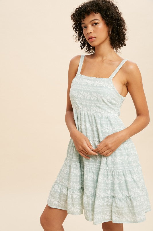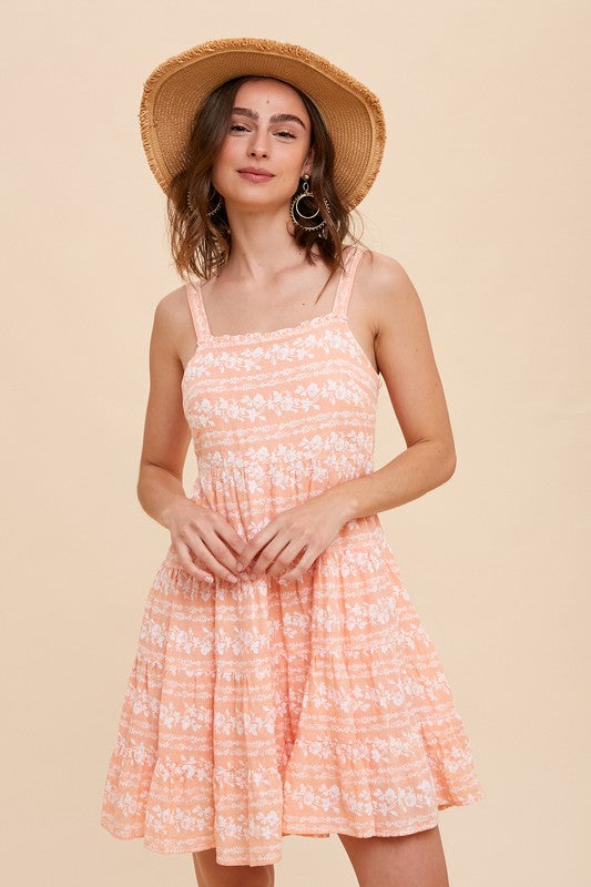 COTTON BLEND SQUARE NECK TIERED MIDI DRESS FEATURES AISLE FLORAL PRINT, INVISIBLE SIDE ZIPPER, SMOCKED BACK, ADJUSTABLE STRAPS AND FULL LINING.