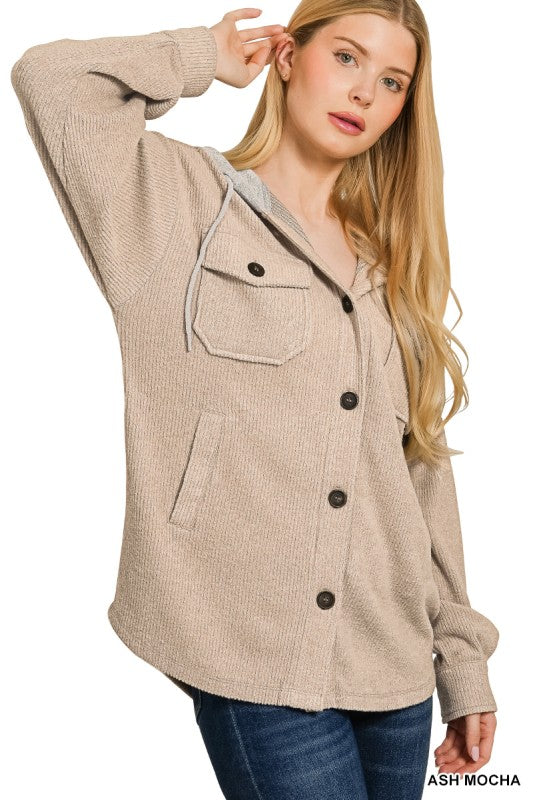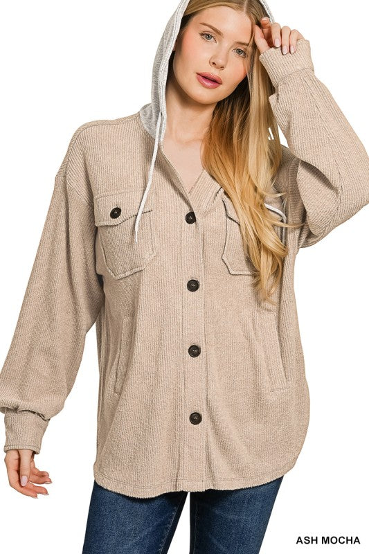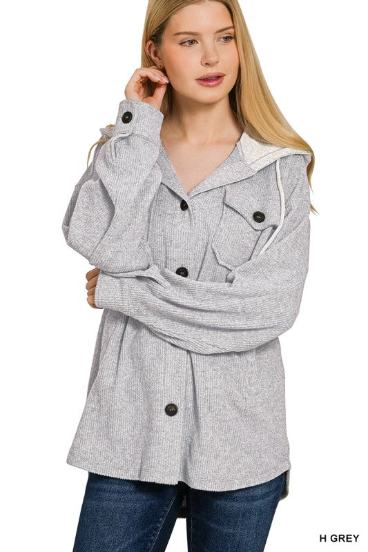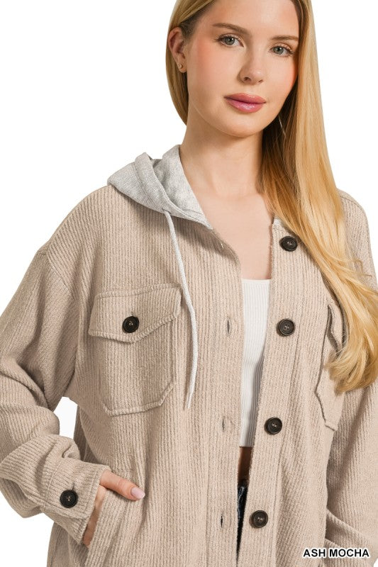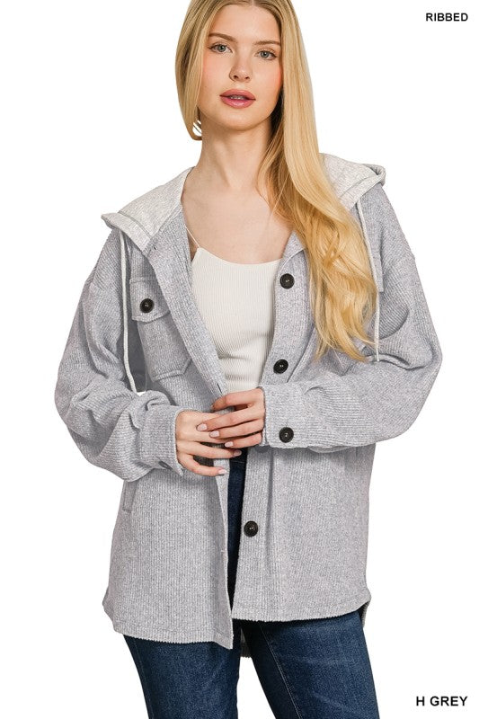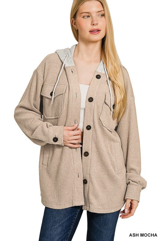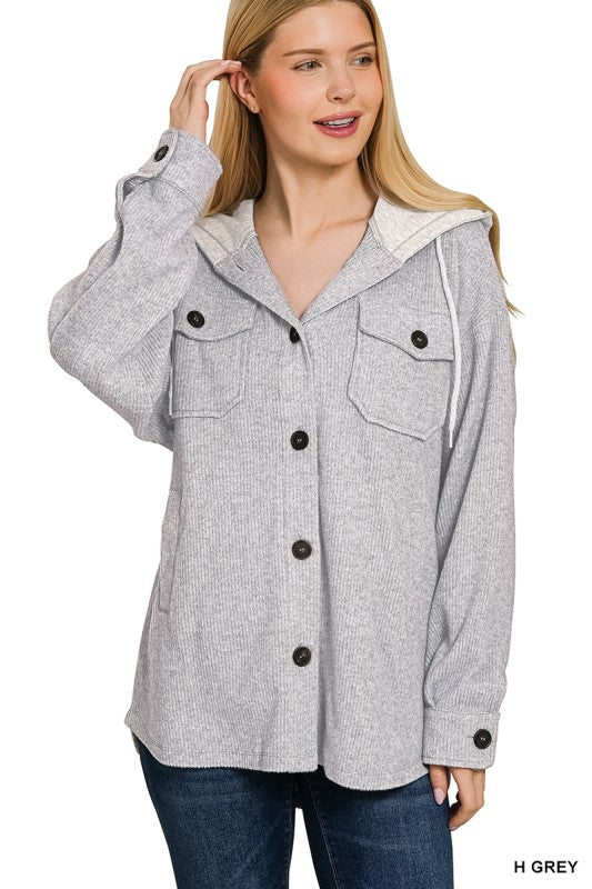 BRUSHED RIB HOODED BUTTON DOWN SHACKET