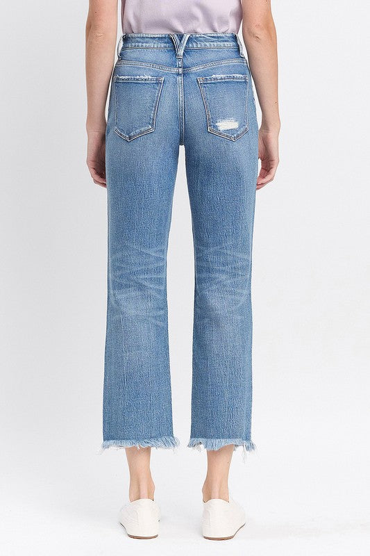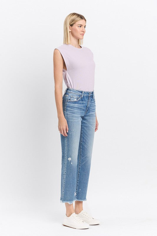 COMFORT STRETCH DENIM, HIGH RISE WAIST, DISTRESSED DETAIL, FRAYED HEM, CROPPED LENGTH, STRAIGHT JEANS